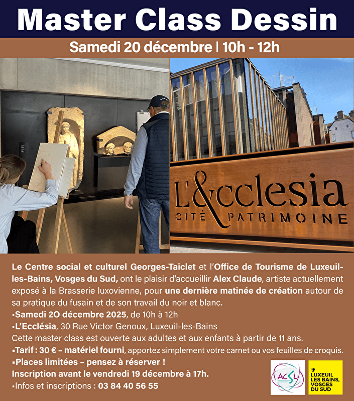 Le Centre social et culturel Georges Taiclet de Luxeuil-les-Bains a le plaisir d’accueillir Alex Claude, artiste actuellement exposé à la Brasserie Luxovienne, pour une matinée de création autour de sa pratique du fusain et du travail du noir et blanc.
