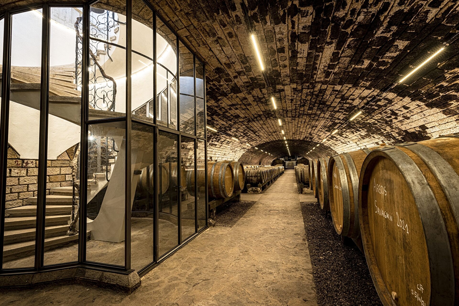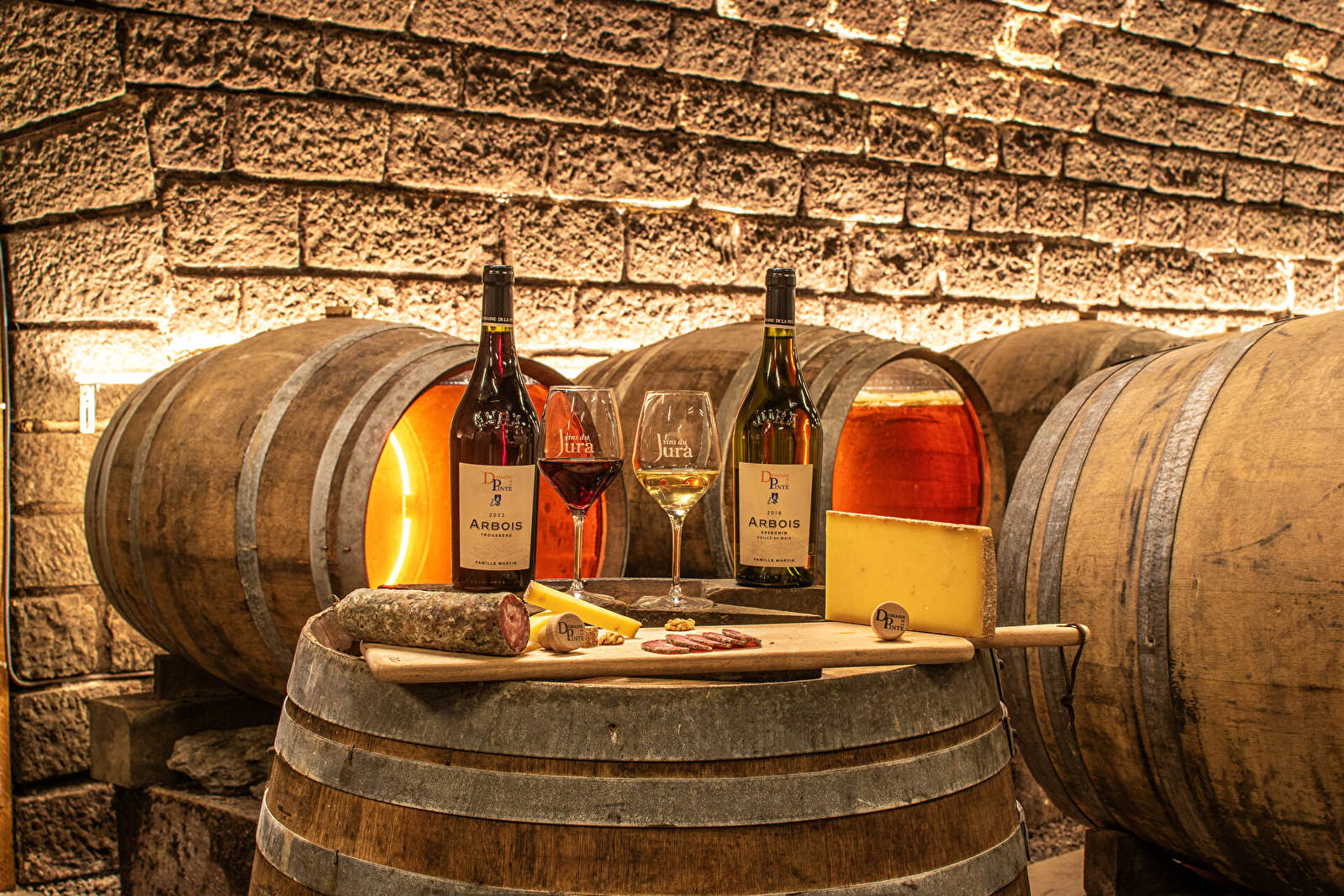 A la sortie d’Arbois, direction Lons-le-Saunier, vous aurez peut-être remarqué une grande bâtisse au milieu des vignes, il s’agit bien du Domaine de la Pinte qui repose sur de magnifiques caves voûtées construites dans la tradition jurassienne. Elles sont visitables sur réservation uniquement auprès du domaine avec bien sûr une dégustation des vins en fin de visite.