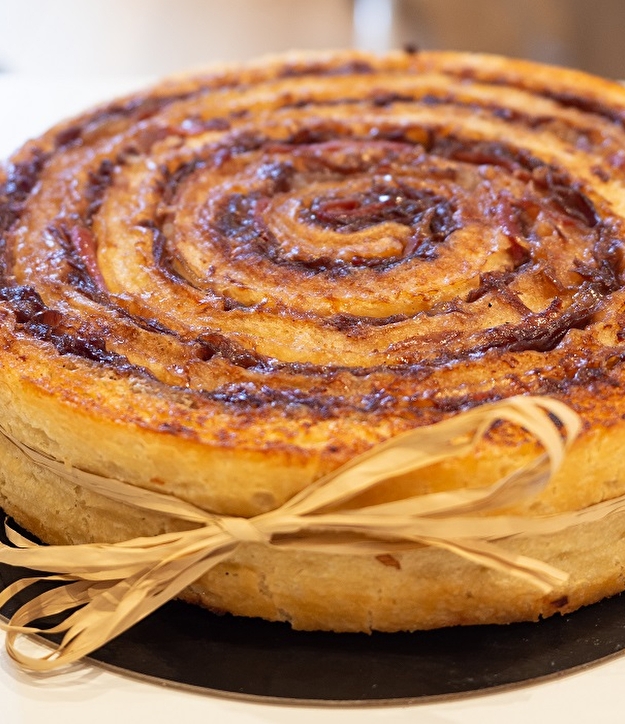 Focaccia bread, onion jam with red wine and Morello cherry juice, and the famous Luxeuil ham, all rolled up and held together by a raffia string.